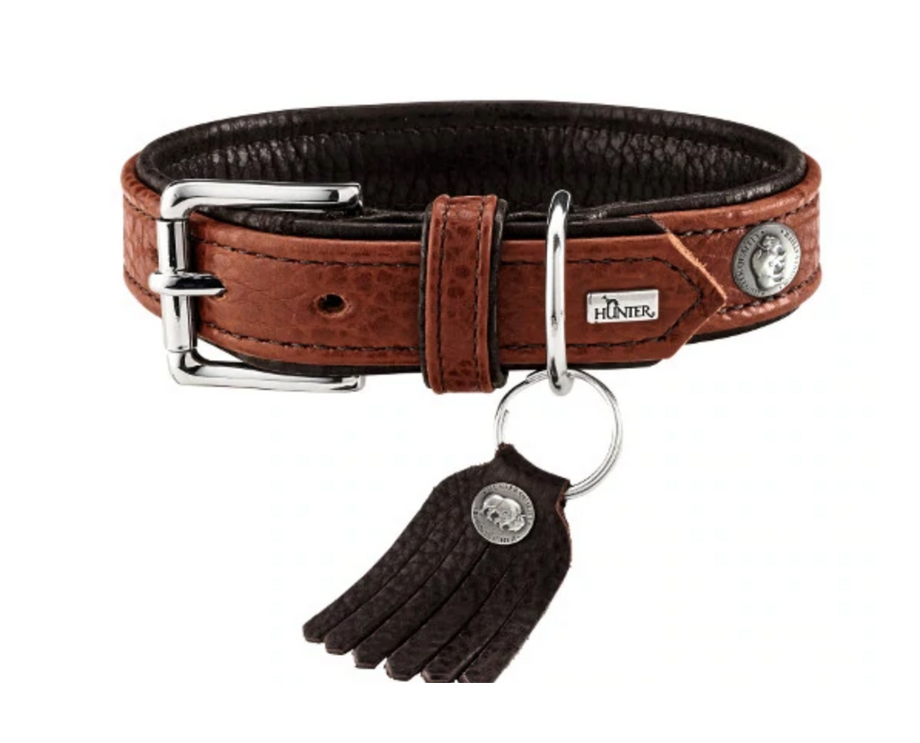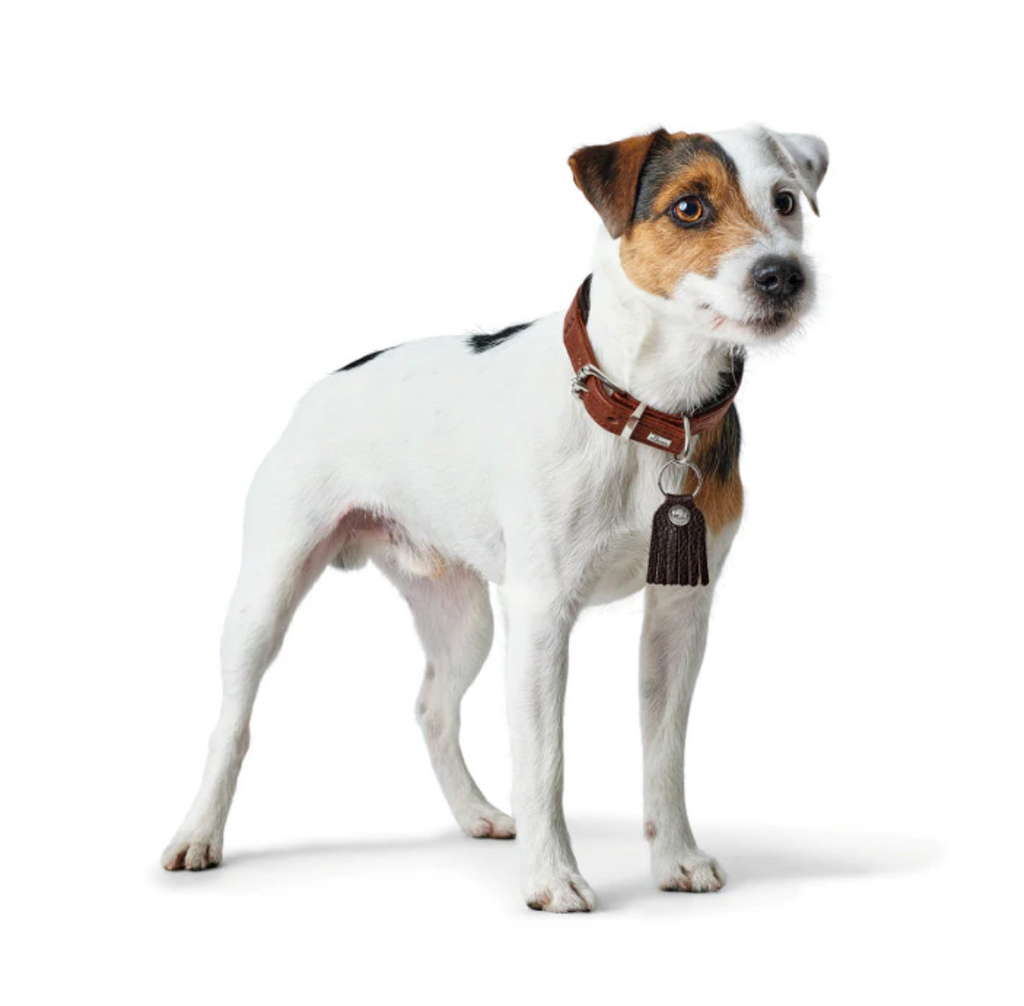 The discreet design of the collar is tastefully highlighted by the bi-colour workmanship and for added decoration, the collar is adorned with a metal emblem featuring a bison motif which is a reference to the exclusive bison leather material. It also features a bison leather removable keyring although this can also be left on as a further embellishment.