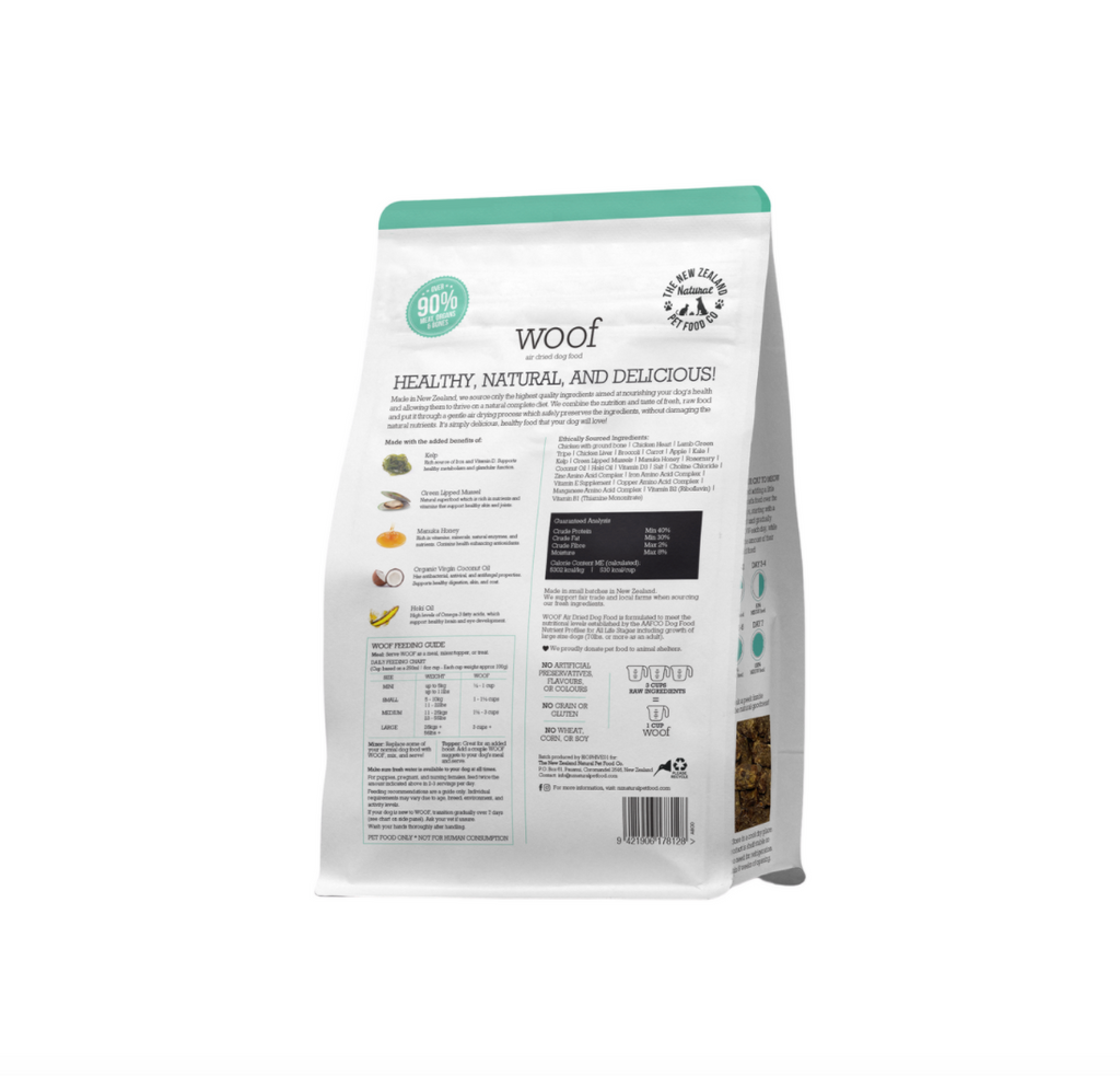 WOOF is made using only the highest quality ingredients aimed at nourishing your pet's health. They combine the nutrition and taste of fresh, raw food and put it through a gentle air drying process which safely preserves the ingredients, without damaging the natural nutrients. It is simply delicious healthy food that your dog will love!