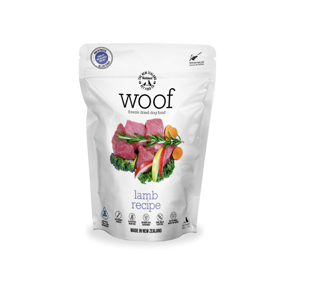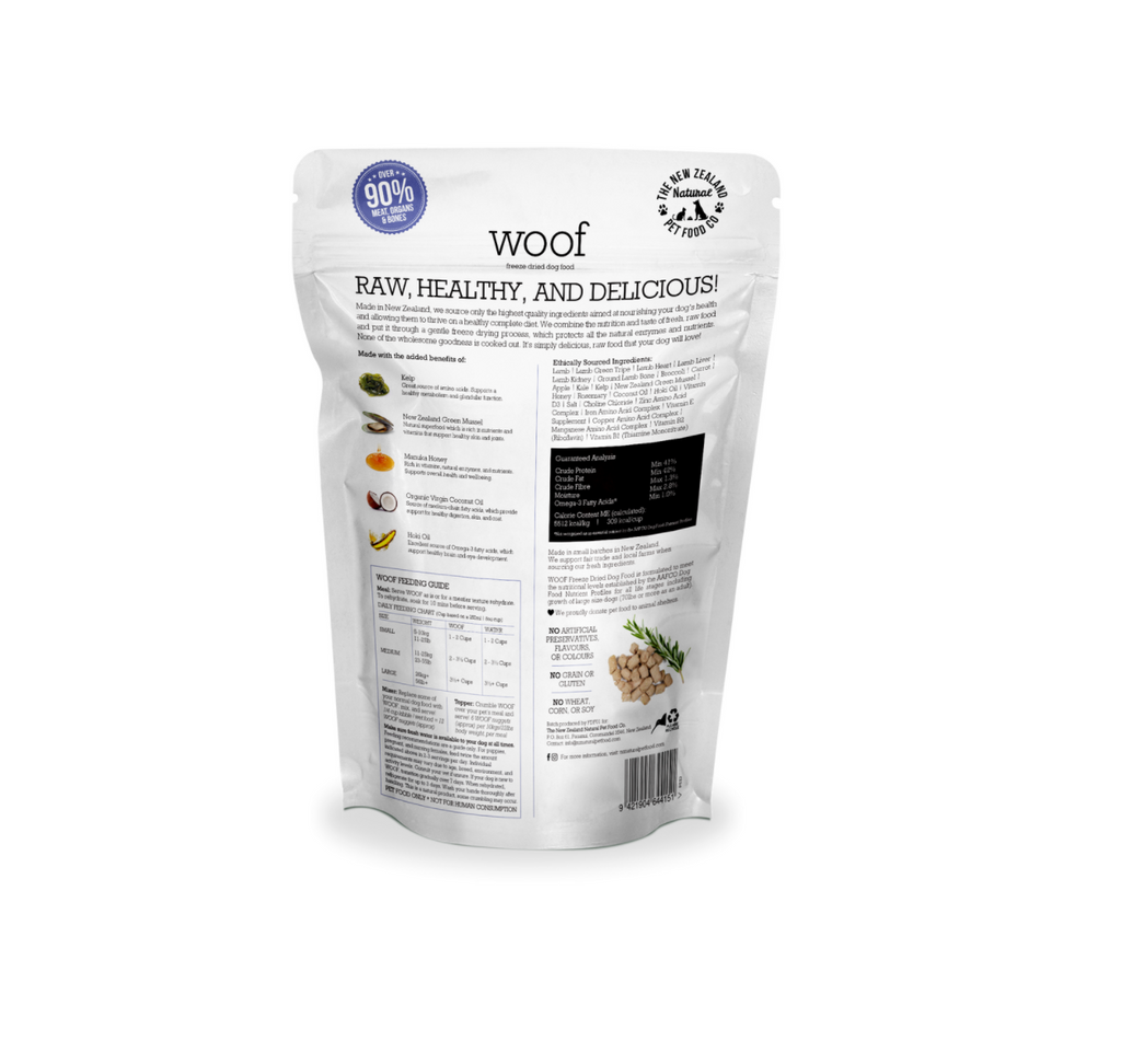 WOOF is made using only the highest quality ingredients aimed at nourishing your pet's health. We combine the nutrition and taste of fresh, raw food and put it through a gentle freeze drying process which protects all the natural enzymes and nutrients, so none of the wholesome goodness is cooked out.